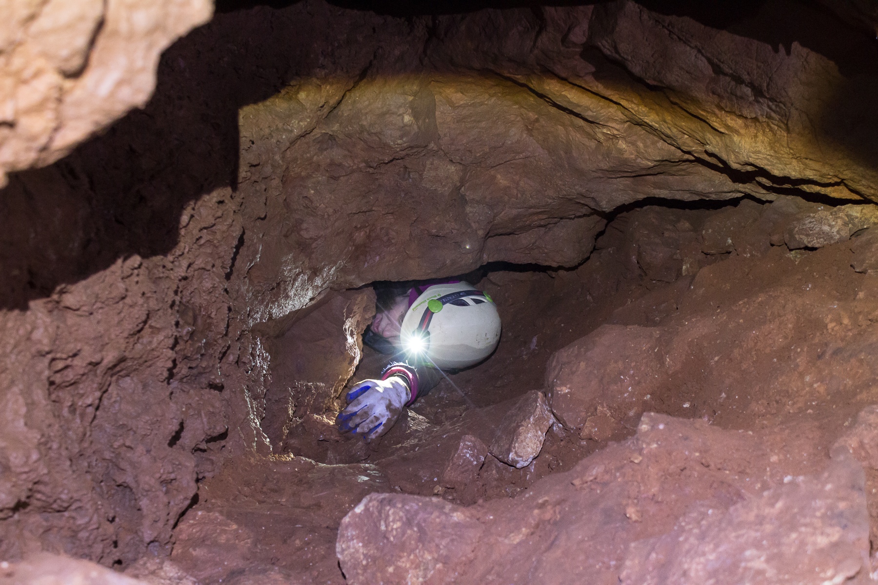 В какой-то момент мы даже открыли тот самый план пещеры, который не точный, но он был не слишком мне понятен, поэтому решили, что проще его закрыть и просто обследовать все проходы какие где увидим. Поэтому мы приступили к активным действиям. Написано, что надо много лазить в распорах, но мы лазили в распорах мало, зато очень очень много ползали на пузе. Местами было узко или очень узко. Приходилось проползать на боку, на спине, на животе, короче это были абсолютно все виды ползания. Сложнее всего это давалось Лене, еще не привычной к подобному. Но и она отлично справлялась.