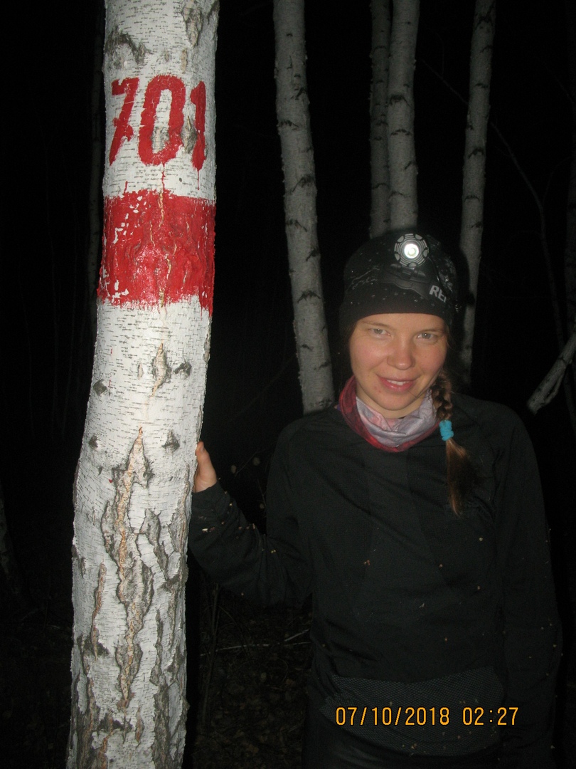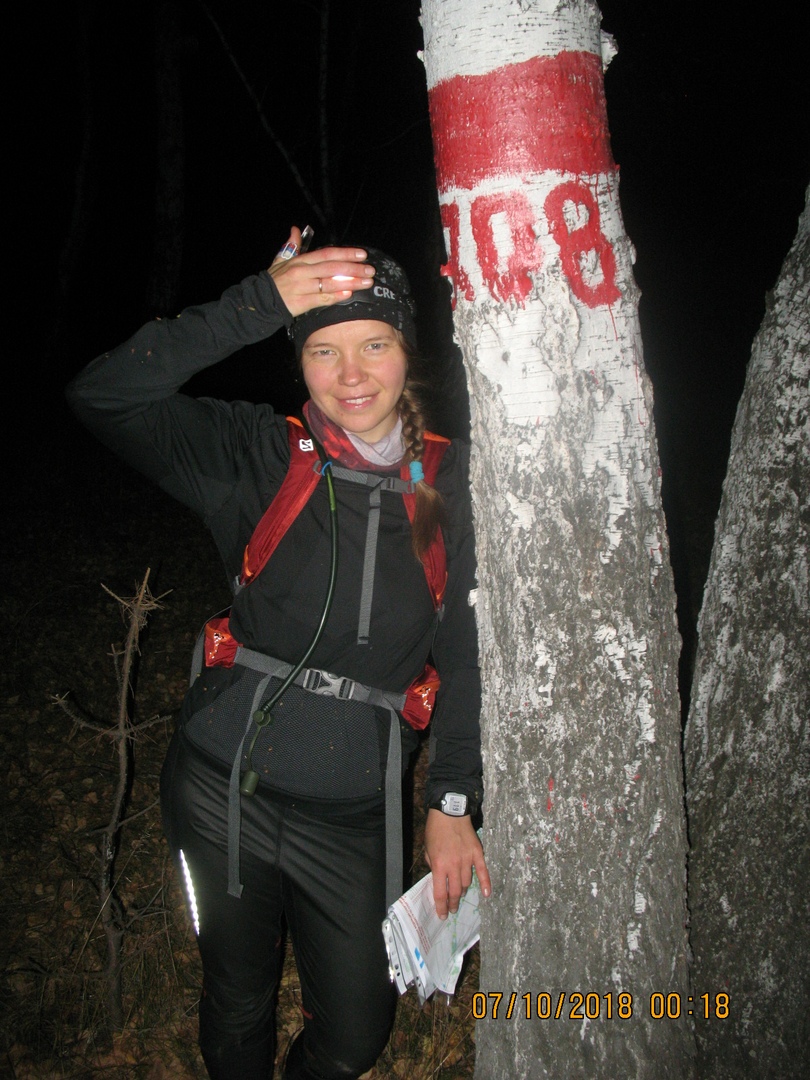 Вылазим на дорогу и на пути к КП 705 встречаем команду девчонок. Они пожелали нам удачи.. да уж, она нам точно не помешает… Дальше по плану дорогой КП 709. Вроде дорога в нужном направлении найдена, но чем дальше, тем она более заросшая. Вышли на пересечение с нужной просекой. Сомнений нет, это она. КП нет. Бегаем в разные стороны, ищем, ночь же.. Может не видно где… Кстати, пока я там искала КП, то вспоминала иногда про радиосвязь ребят: если ночью вам станет одиноко и почувствуете себя одними на краю вселенной… можно просто включить рацию. Но у нас ее нет:-) После того как мы оставили там прилично времени, до нас доходит, что на карте есть более темная штриховка — елки или сосны. Вообще эти елки там повсюду, и сначала мне казалось они как раз от нас справа. Но тут понимаю, что это пятно на карте означает что-то другое — более густой еловый лес и он от нас слева. Значит мы вышли на просеку по другой дороге, которой нет в карте! Идем по просеке на север и выходим к КП… Уф и полный пипец… 50 минут ушло на взятие этого КП.