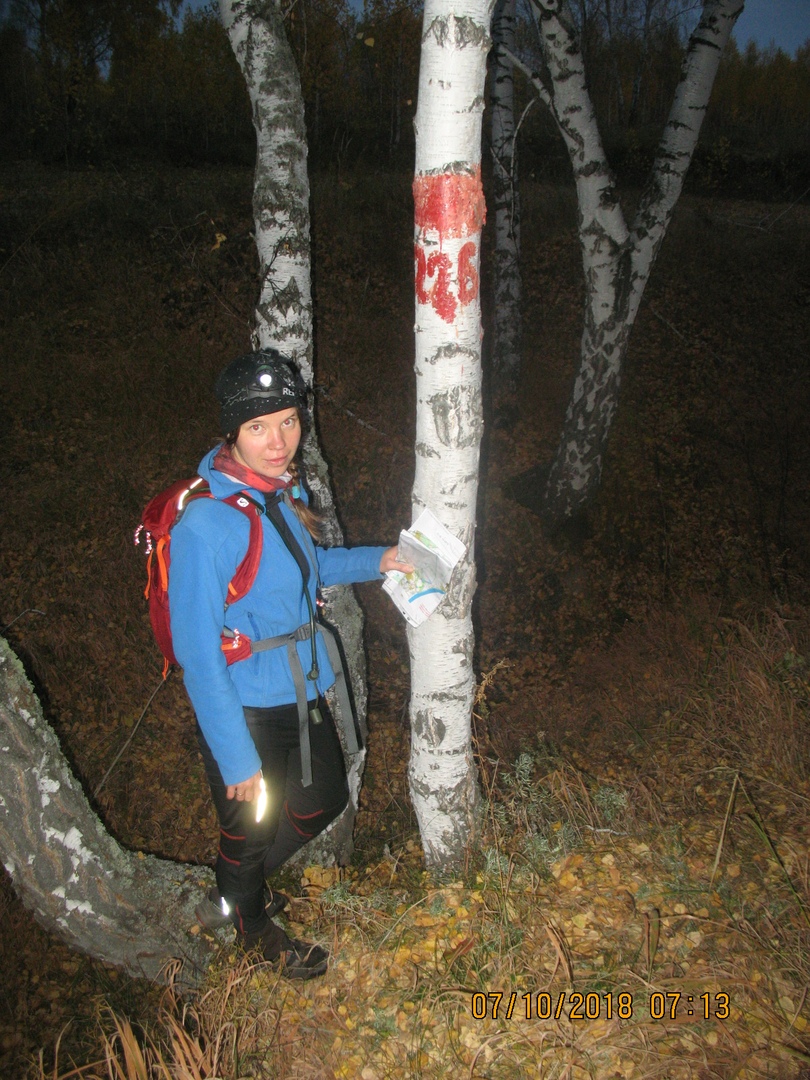 Но и это еще было не все! Омский поход продолжал испытывать нас на прочность! Выйдя на дорогу, мы, конечно же, попытались хоть немного вытащить себя из Ж не очень хорошего положения и побежали. Хотя вообще на сутках мы раньше никогда не передвигались бегом, да и в этот раз думали побегать лишь несколько первых часов. Подходим к следующему КП 810. Видим здесь фонари. Это ребята из формата вело экстрим. КП находится где-то в овраге. Сначала они пытались просветить его с края оврага фонарями. А свет у них был очень мощный! Две огромные фары на великах, да и так фонари мощные. Наши фонари, кстати, за ночь почти сели, и мы останавливались менять батарейки. В общем тактика высвечивания КП с края оврага ничего не дала. Эх, была б на нем светоотражайка, как на обычных рогейнах! Чтобы не прочесывать весь овраг я вглядываюсь в карту и пытаюсь точнее определить, где смотреть. Вроде определились с местом. Оказалось, что в овраге течет ручей, ребята помогли мне через него перебраться. Заходим в лес, с краю КП нет, углубляться вроде как не стоит. Еще раз смотрю в карту. Мозг, видать начал просыпаться. Понимаю, что это наверное не тот околок. Один из ребят идет смотреть туда, где как я и думала должен быть КП, и кричит: нашел! Радостно бежим туда. Фотаемся… И видим, что у этого КП совсем другой номер! Это не 810! Может ли быть такое что в одном месте так рядом и тот и этот КП? Странно. Очень странно.